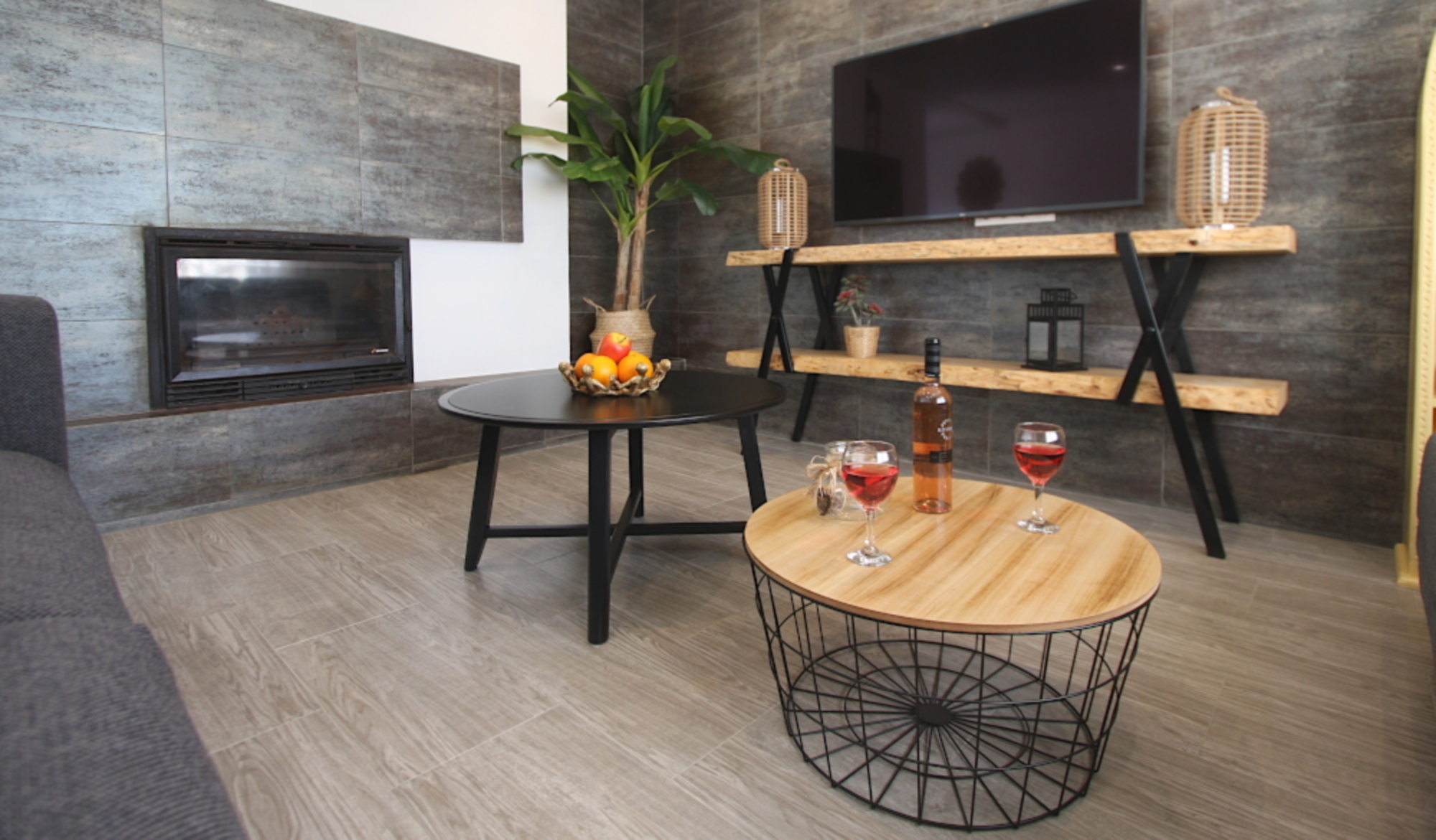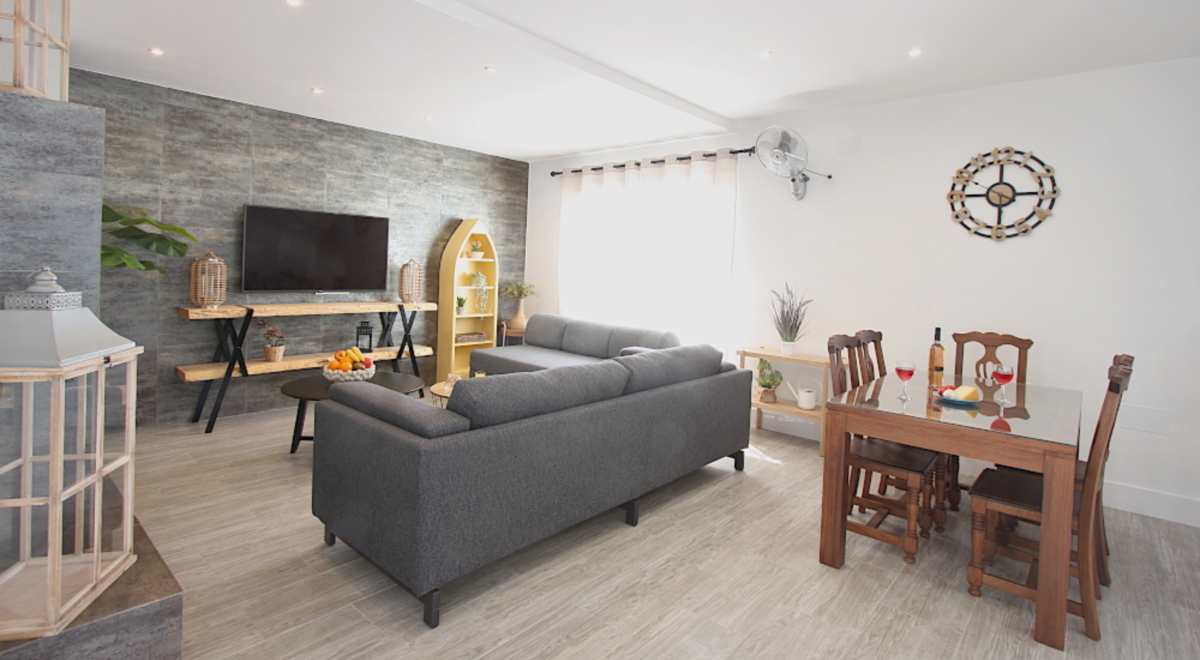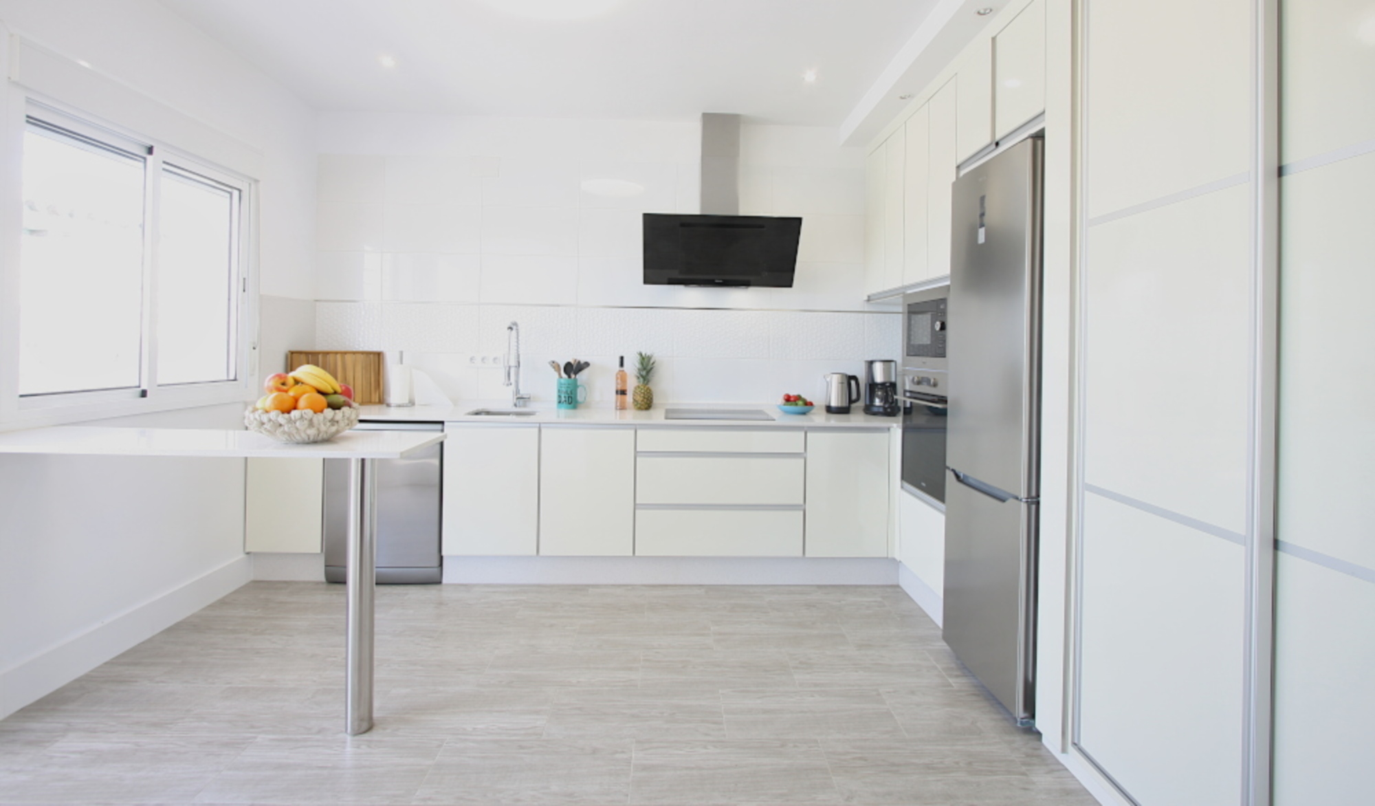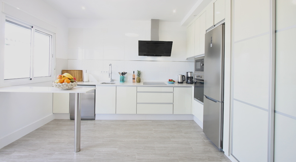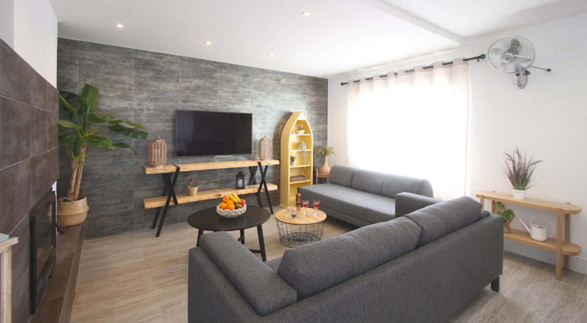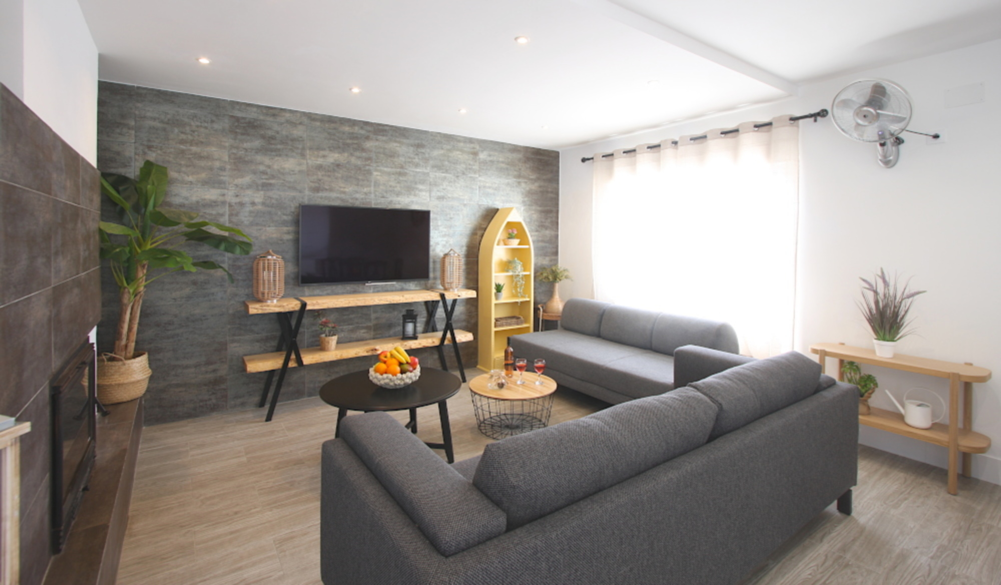 - Single-storey house. Living-dining room with Smart TV, open-plan kitchen with dishwasher.